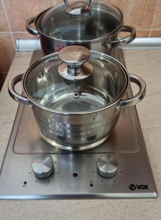 Kitchenette, Refrigerator, Electric kettle, Stovetop, Cleaning products, Dining table, Wine glasses
