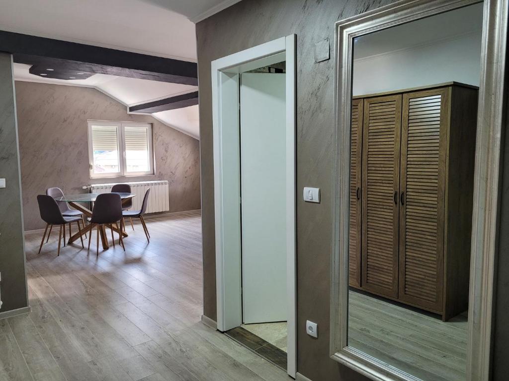 The distance from the center of Vrnjačka Banja to the apartment is around 550 m.